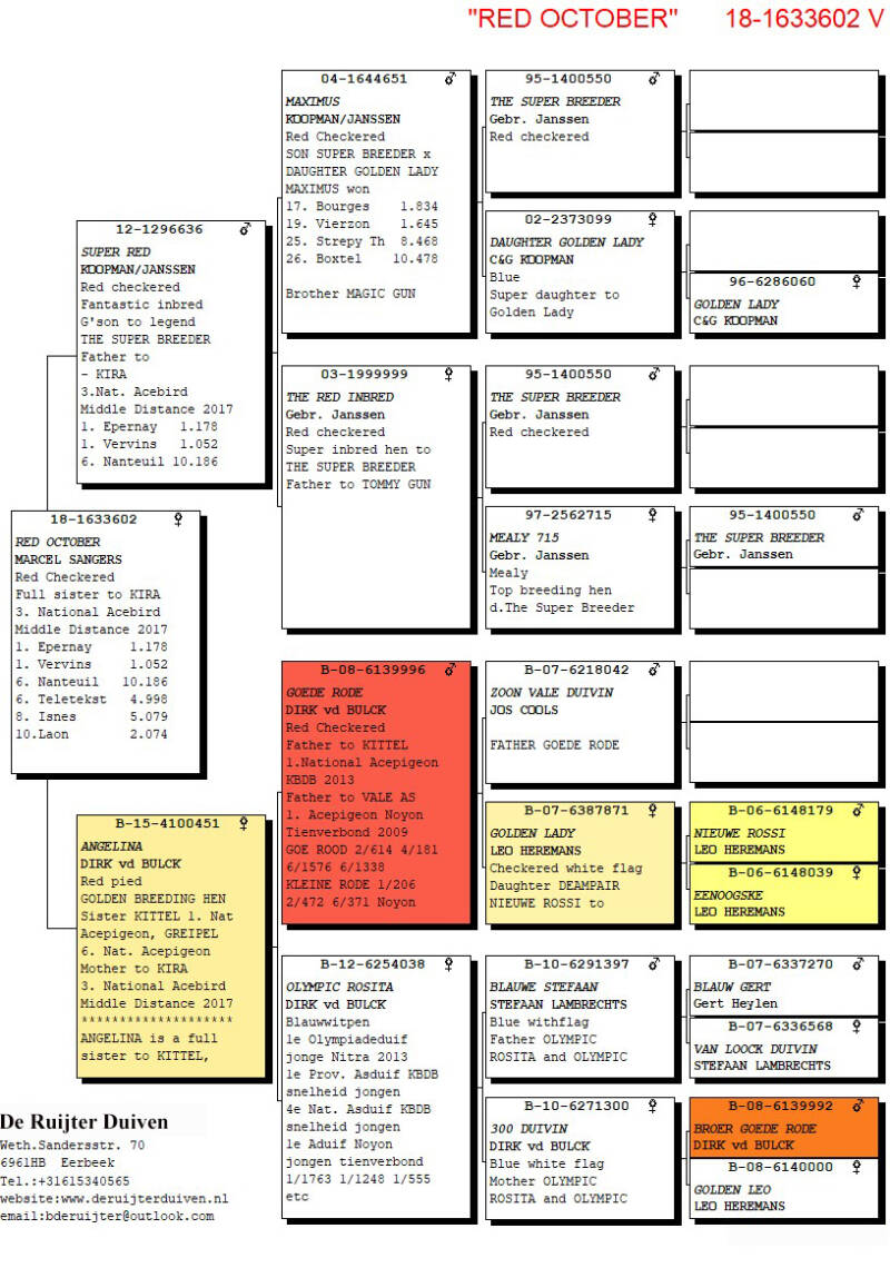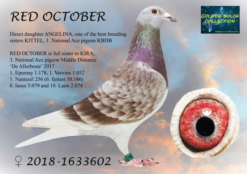 Exeptional breeding hen, fantastic build and direct from super breeding hen ANGELINA, full sister to KITTEL 1. National Ace Pigeon and GREIPEL 6. National Ace Pigeon. RED OCTOBER is full siter to KIRA, 3. National Ace Pigeon Middle Distance "de allerbeste"2017