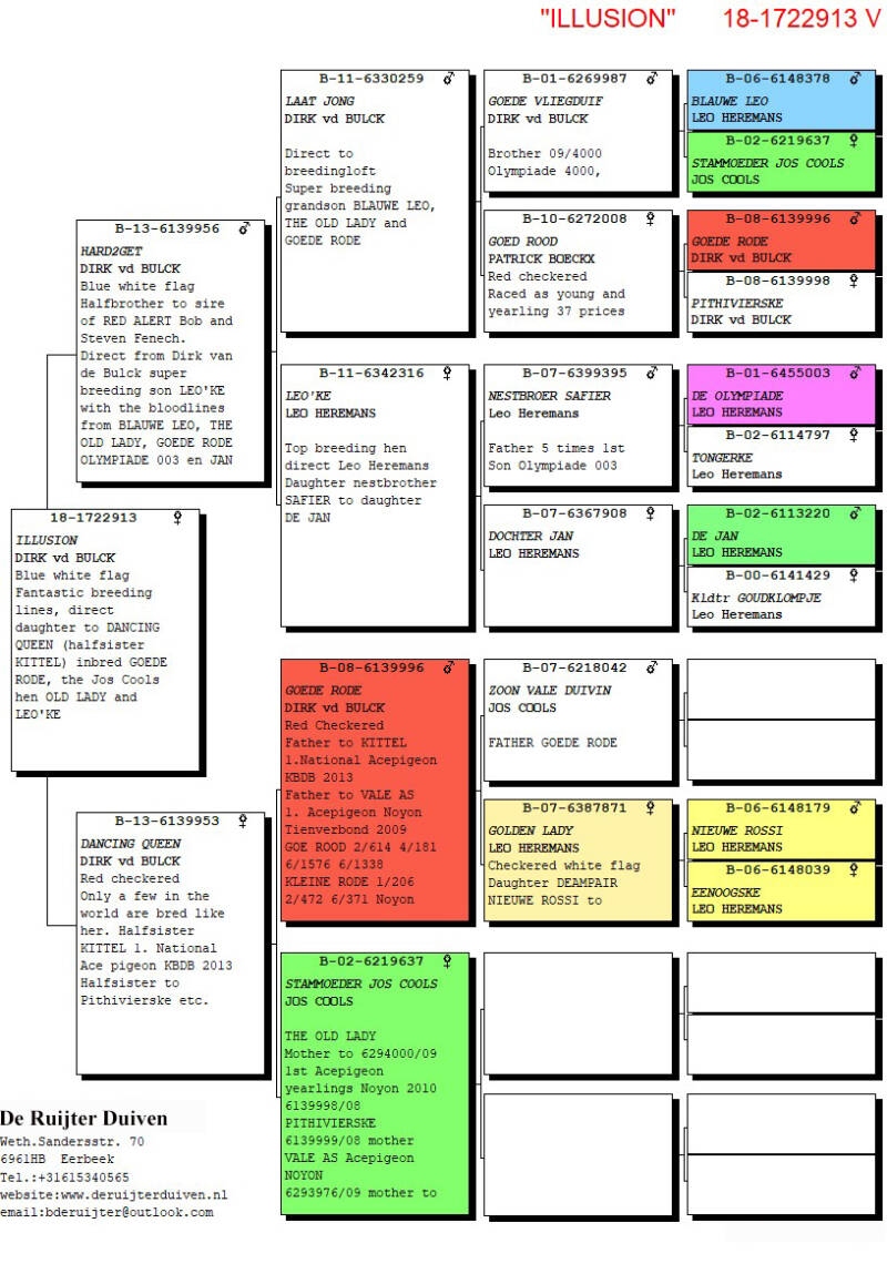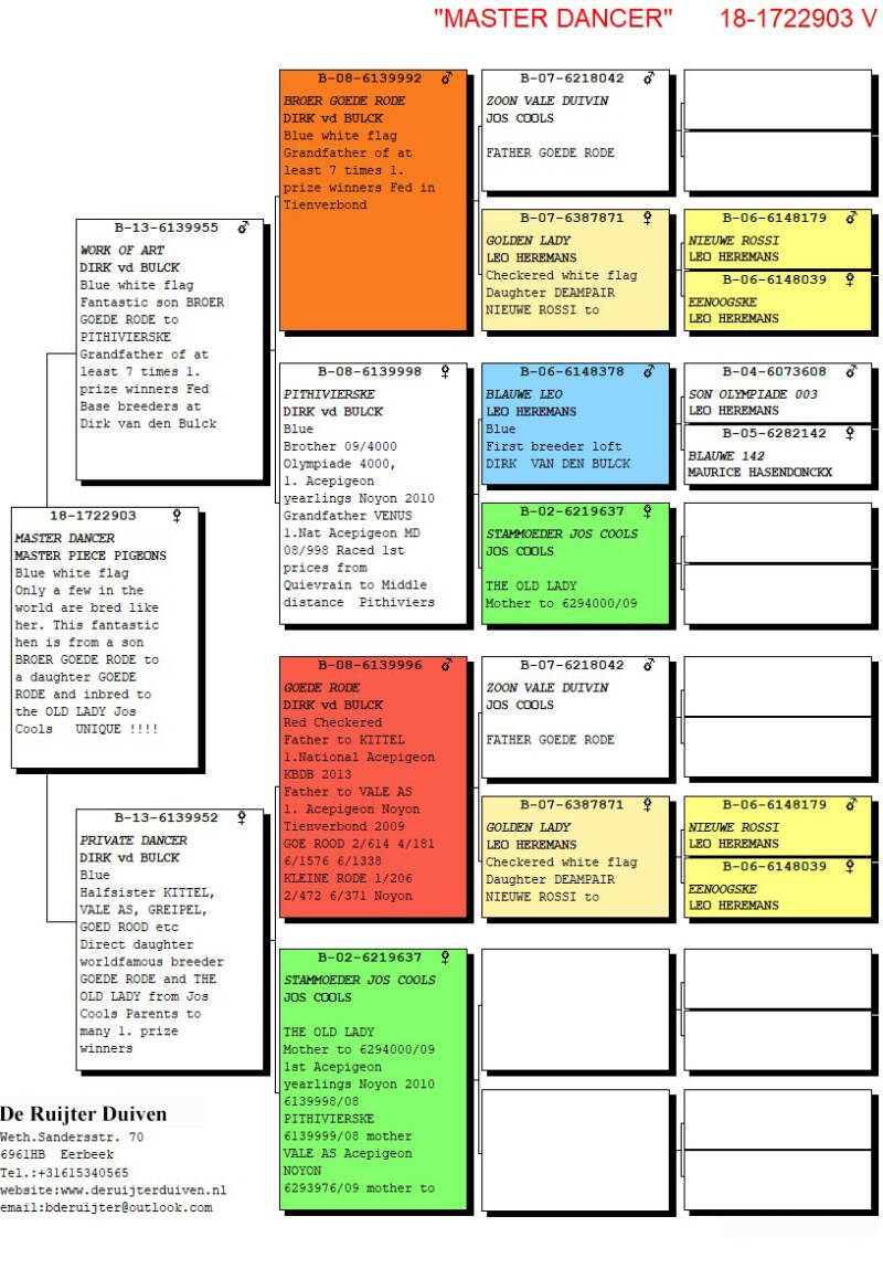 Mother is from GOEDE RODE, father to KITTEL, 1. National Ace Pigeon, GREIPEL, 6. National Ace Pigeon, he was paired up to THE OLD LADY loft Jos Cools. Only a few in the world are bred like her.