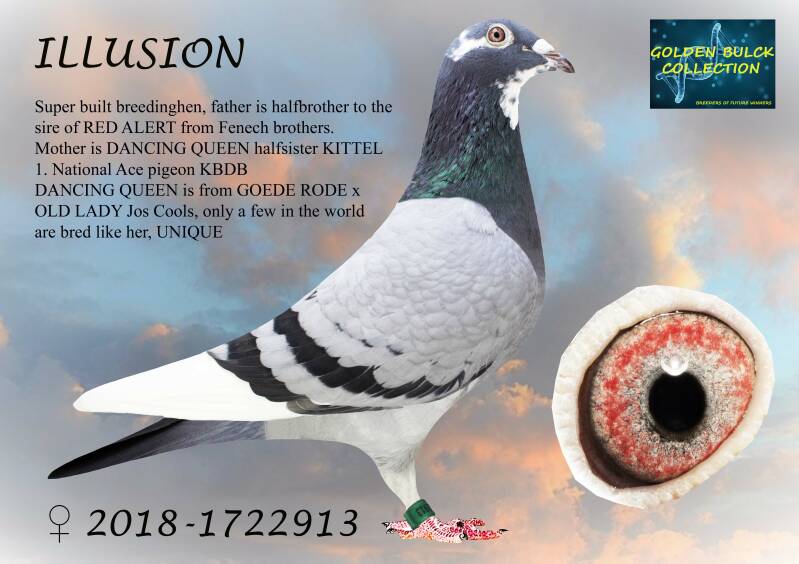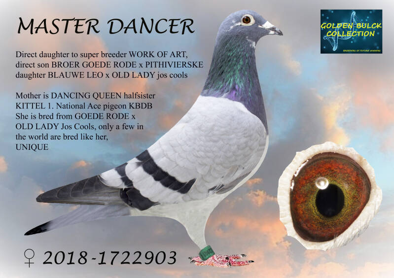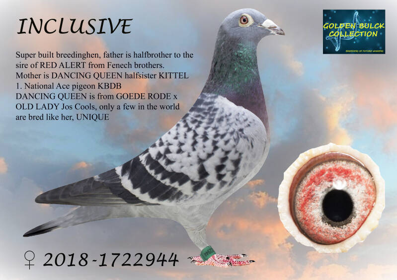 Super built breedinghen, father is direct Dirk van den Bulck and halfbrother to the sire of RED ALERT. Mother is DANCING QUEEN, she is from GOEDE RODE, father to KITTEL 1. National Ace Pigeon, Greipel 6. National Ace Pigeon and THE OLD LADY loft Jos Cools, only a few in the world are bred like her, unique breedinghen