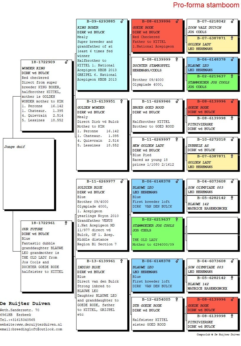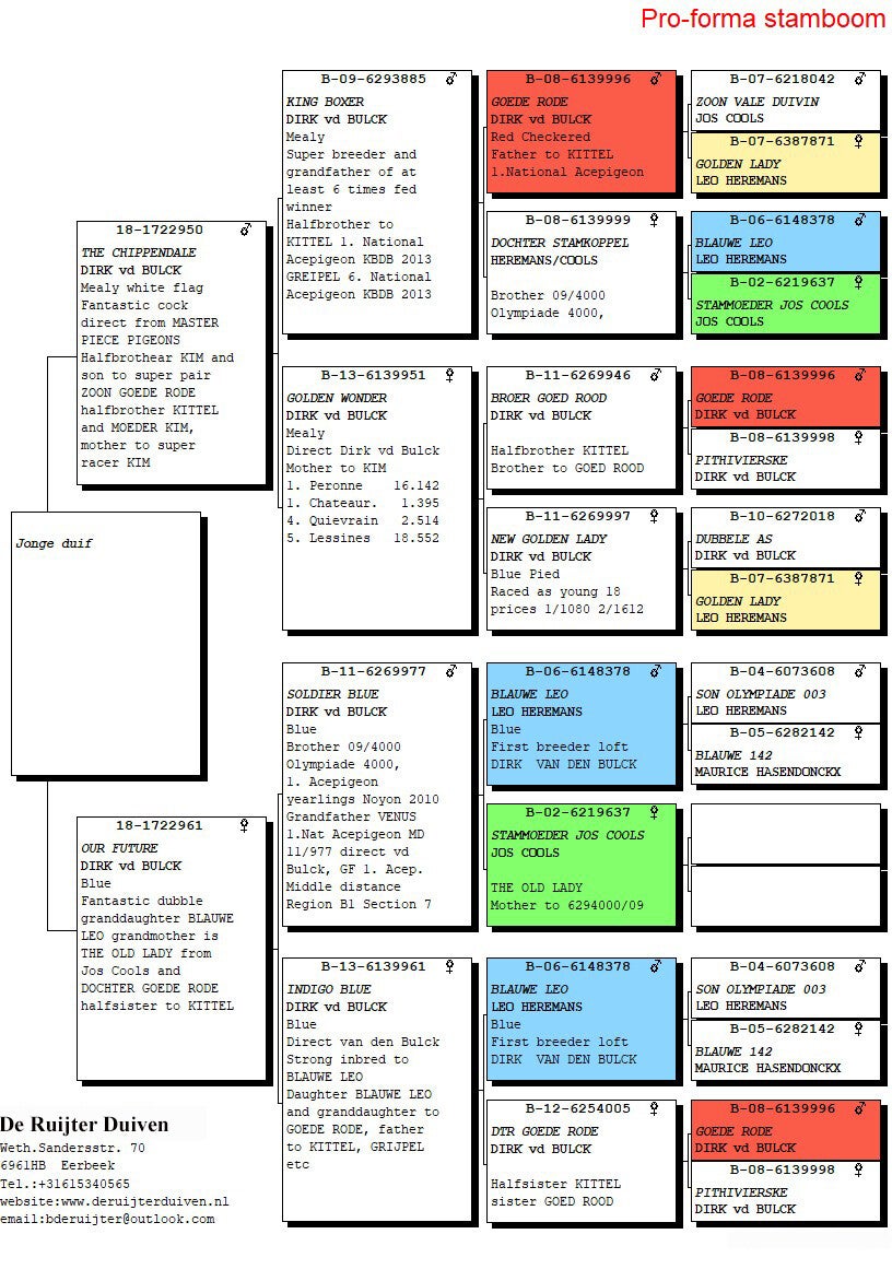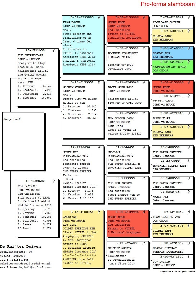 Fantastic breedingpair, THE CHIPPENDALE is direct from super breeder KING BOXER, halfbrother KITTEL, RED OCTOBER is direct daughter ANGELINA sister KITTEL, she is full sister to KIRA, 3. National Acepigeon Middle Distance
