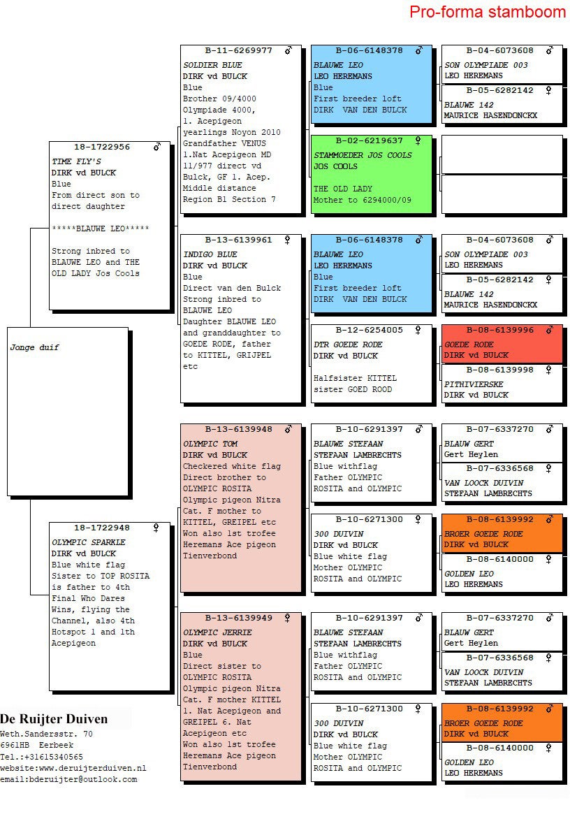 Amazing breedingpair, BLUE SEAN 07 is very strong inbred from son to daughter BLAUWE LEO, basic breeder at Dirk van den Bulck, also grandfaher to SAGAN,